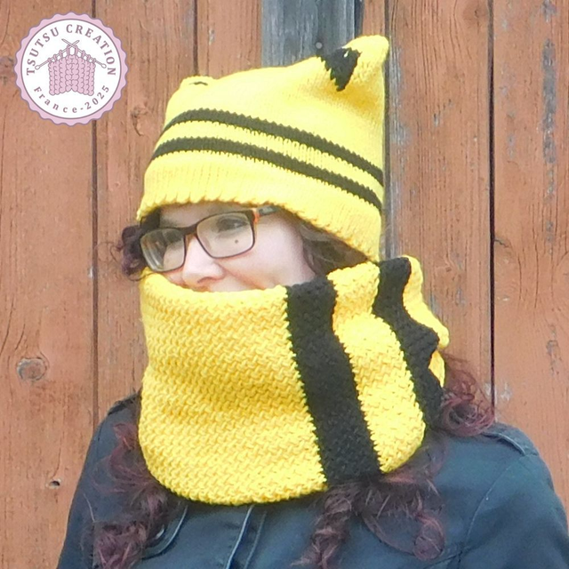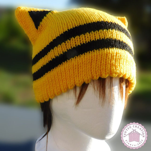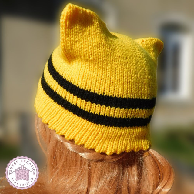 Soit vous aimez ces couleurs, soit vous comprenez l'inspiration de la maison Poufsouffle de Harry Potter et vous le montrerez avec ce bonnet aux oreilles de chat tricoté à la main ! Un peu de fantaisie durant l'hiver ne fait pas de mal.
