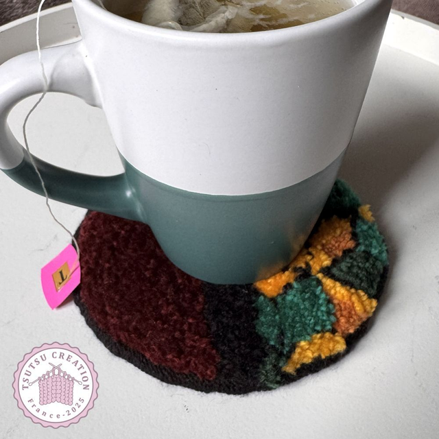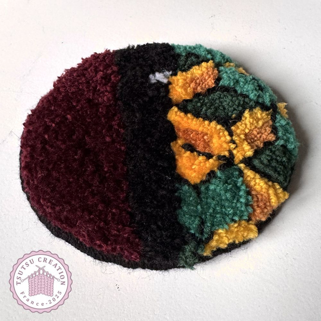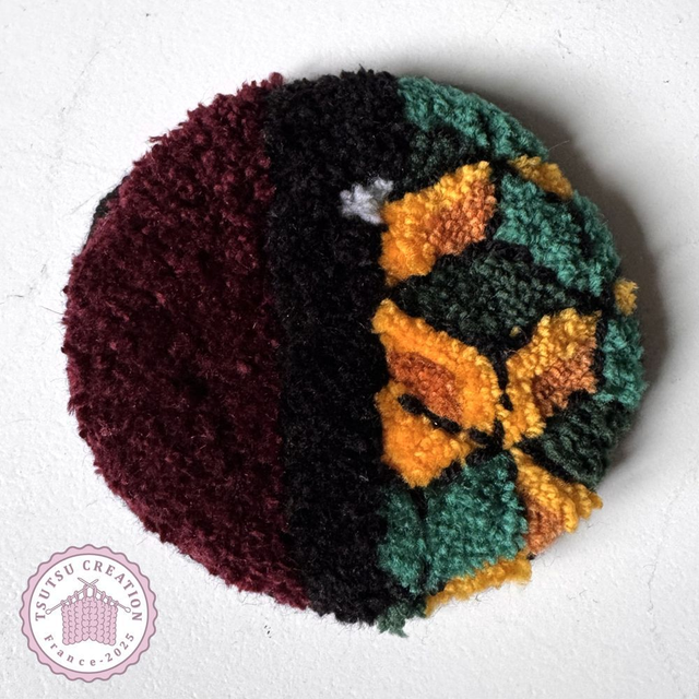 Entièrement fait à la main avec la technique du punch needle, munis d'un tissu anti-dérapant et finitions à la main également.