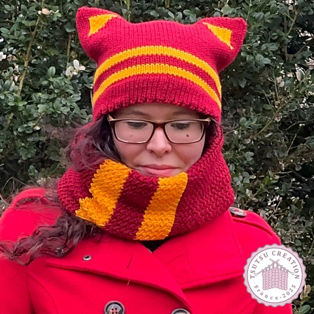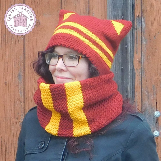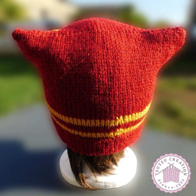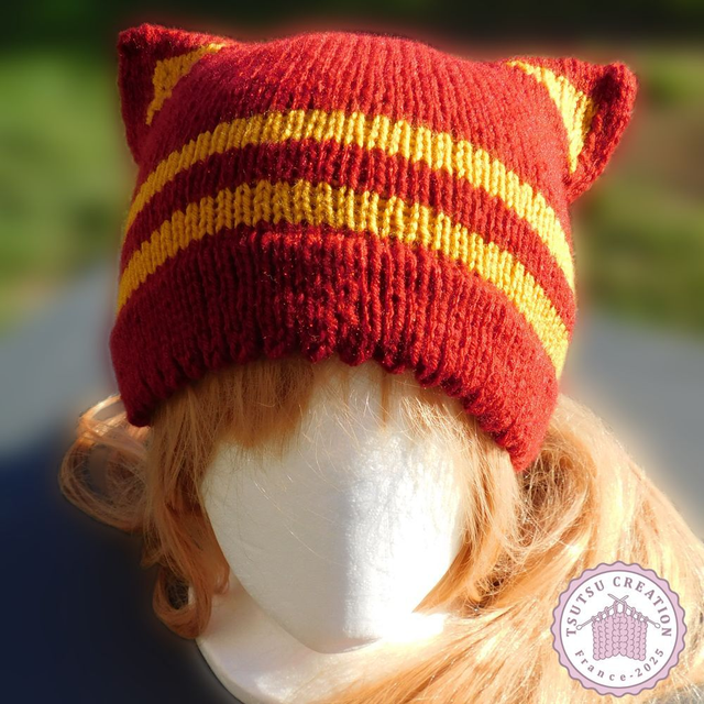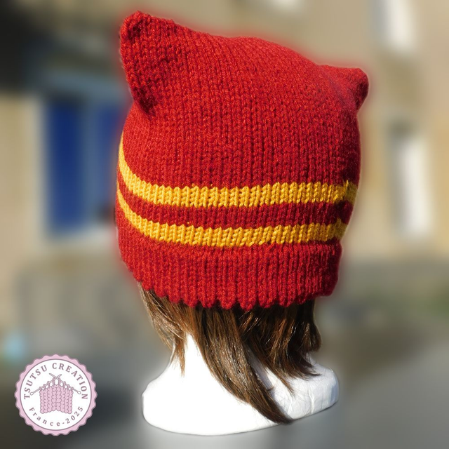 Soit vous aimez ces couleurs, soit vous comprenez l'inspiration de la maison Gryffondor de Harry Potter et vous le montrerez avec ce bonnet aux oreilles de chat tricoté à la main ! Un peu de fantaisie durant l'hiver ne fait pas de mal.